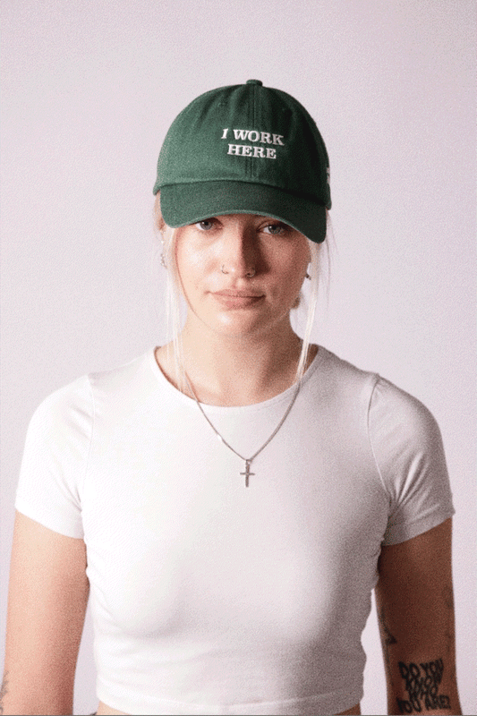 I work here Cap "Let me help" Dad Hat